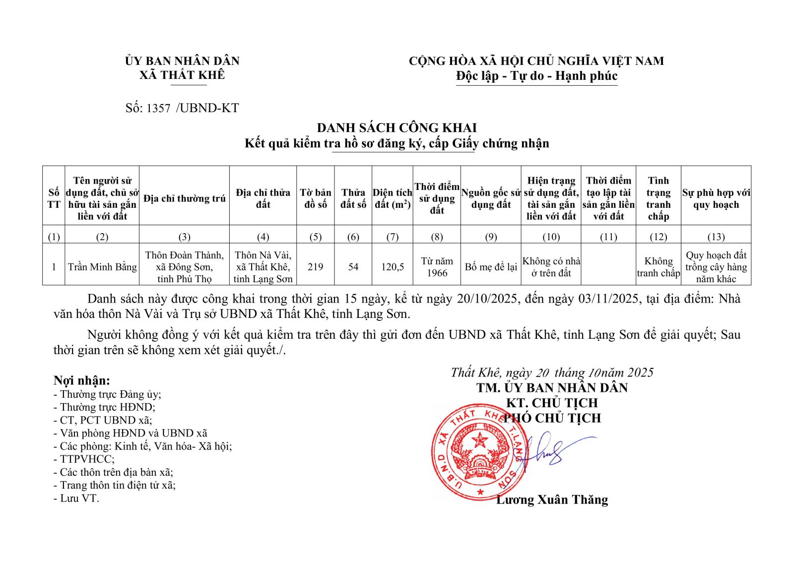 Thứ ba, 21/10/2025 | 07:29 A- A A+ | Công khai niêm yết cấp Giấy chứng nhận lần đầu Chia sẻ Đọc bài Lưu Tác giả: Trang Thông tin điện tử xã Thất Khê Nguồn:thatkhe.langson.gov.vn Sao chép liên kết Tin tức liên quan Thất Khê tổ chức Lễ ra mắt Mô hình “Phụ nữ tự lực” và tập huấn, tuyên truyền nâng cao kiến thức chăm sóc sức khỏe, kỹ năng tự chăm sóc, bình đẳng giới và hòa nhập xã hội cho phụ nữ khuyết tật. Công khai niêm yết cấp Giấy chứng nhận lần đầu Đại hội Đại biểu Hội Liên hiệp Phụ nữ xã Thất Khê lần thứ I, nhiệm kỳ 2025-2030 Thất Khê tổ chức lao động chỉnh trang một số điểm thuộc Khu di tích lịch sử Đường số 4 Ngân hàng Agribank Chi nhánh Thất Khê đến tặng quà cho nhân dân xã bị ảnh hưởng lũ lụt cơn bão số 11 Công an xã Thất Khê không quản ngại gian khó, hết mình vì Nhân Dân giữa tâm bão Matmo 🌧️ Tuyên truyền khám tuyển nghĩa vụ quân sự năm 2026 Thông báo số điện thoại đường dây nóng UBND xã Thất Khê tổ chức tặng quà cho thiếu niên, nhi đồng ở 33 thôn bản, 13 trường học và Mái ấm tình thương Vinh Sơn