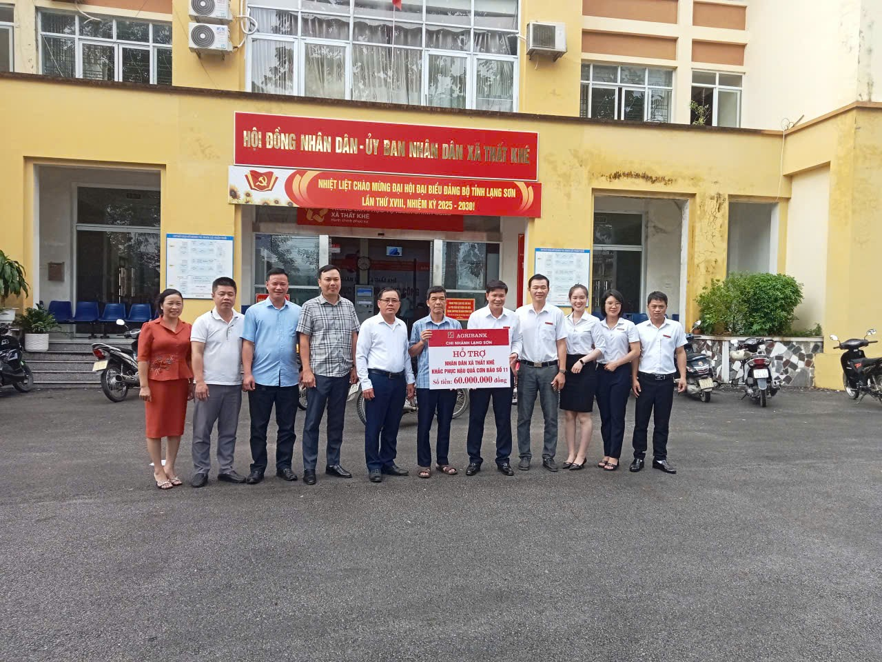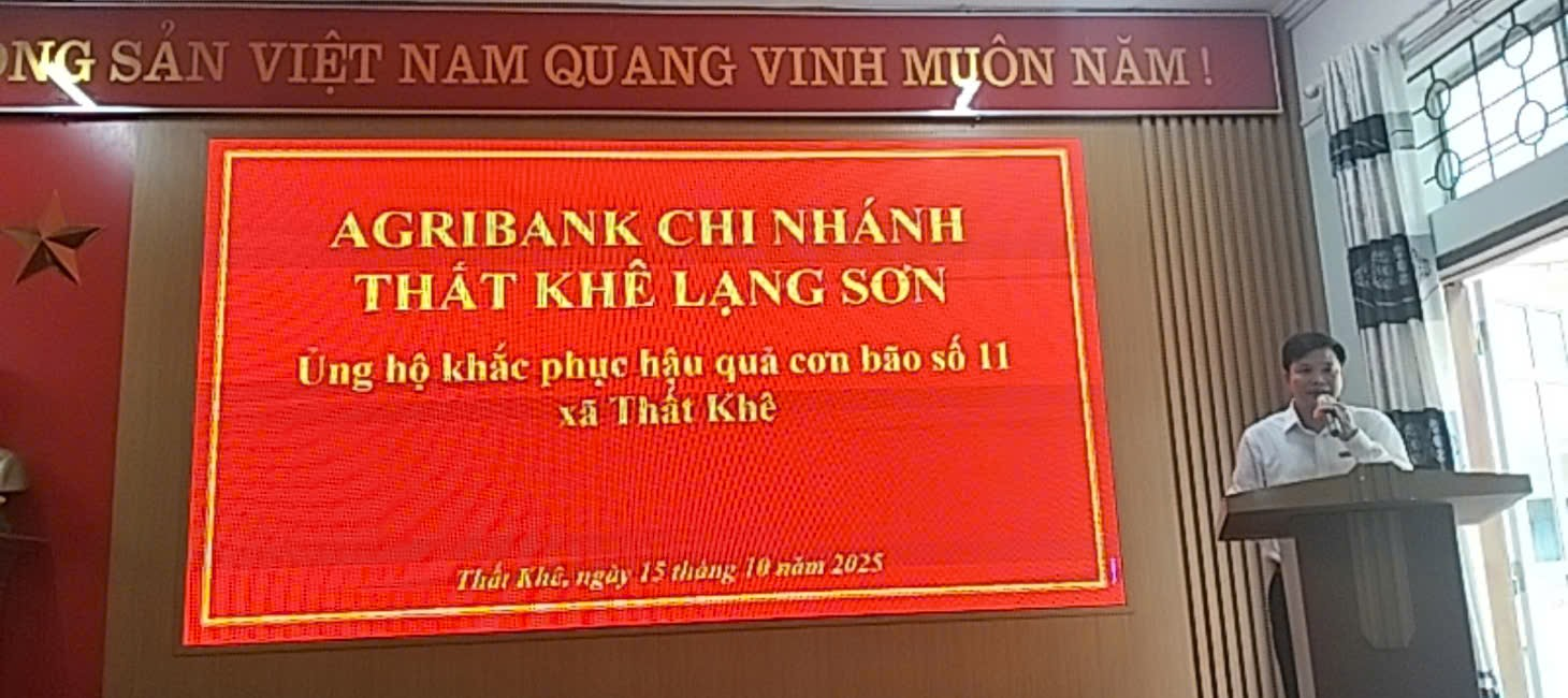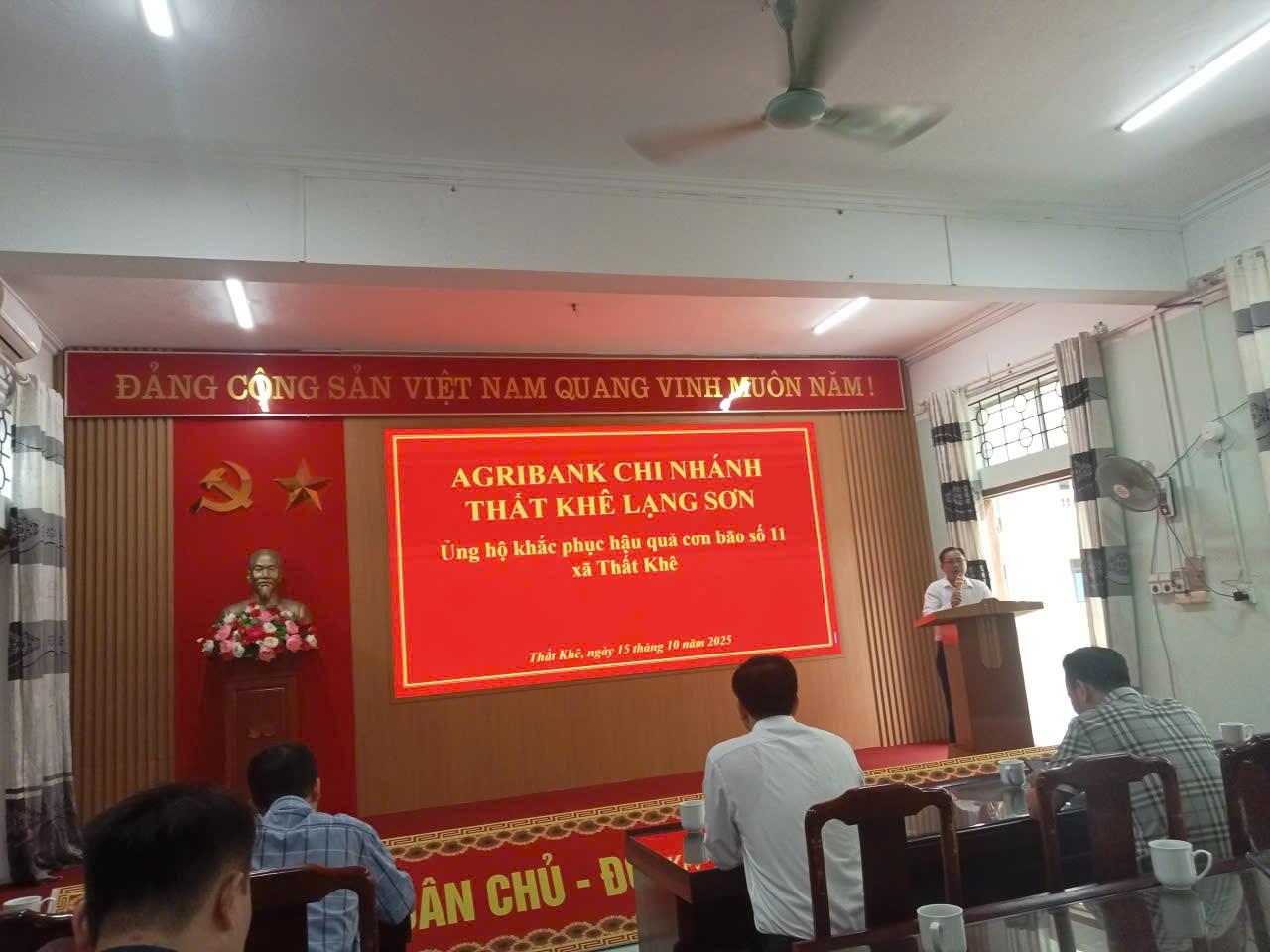 Sáng ngày 15 tháng 10 năm 2025, tại hội trường UBND xã Thất Khê lãnh đạo Ngân hàng Agribank Chi nhánh Thất Khê đến tặng quà cho nhân dân xã Thất Khê bị ảnh hưởng lũ lụt cơn bão số 11.