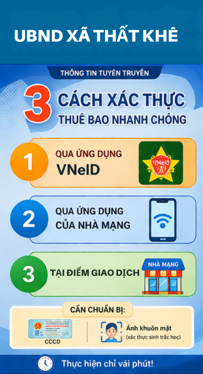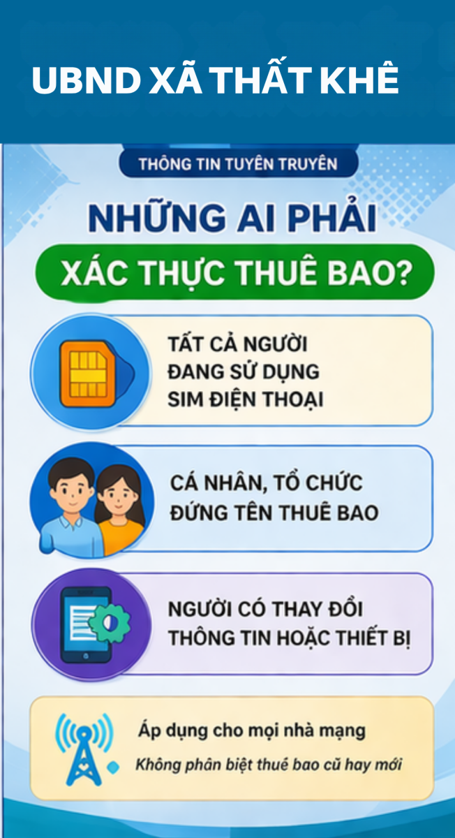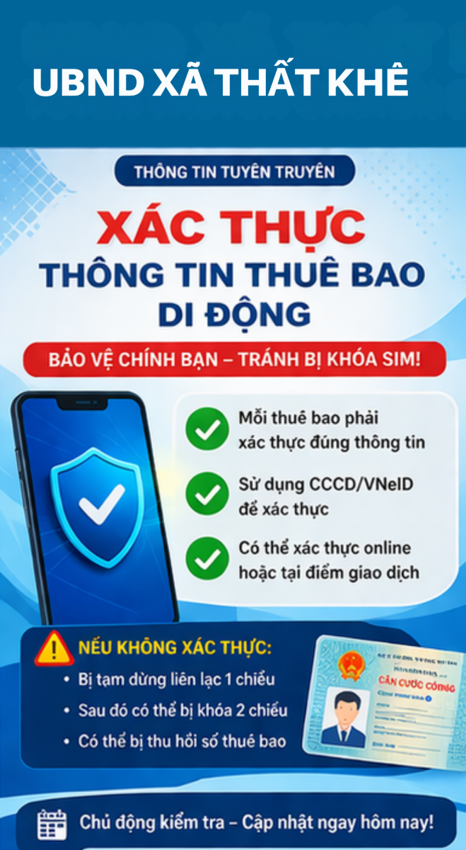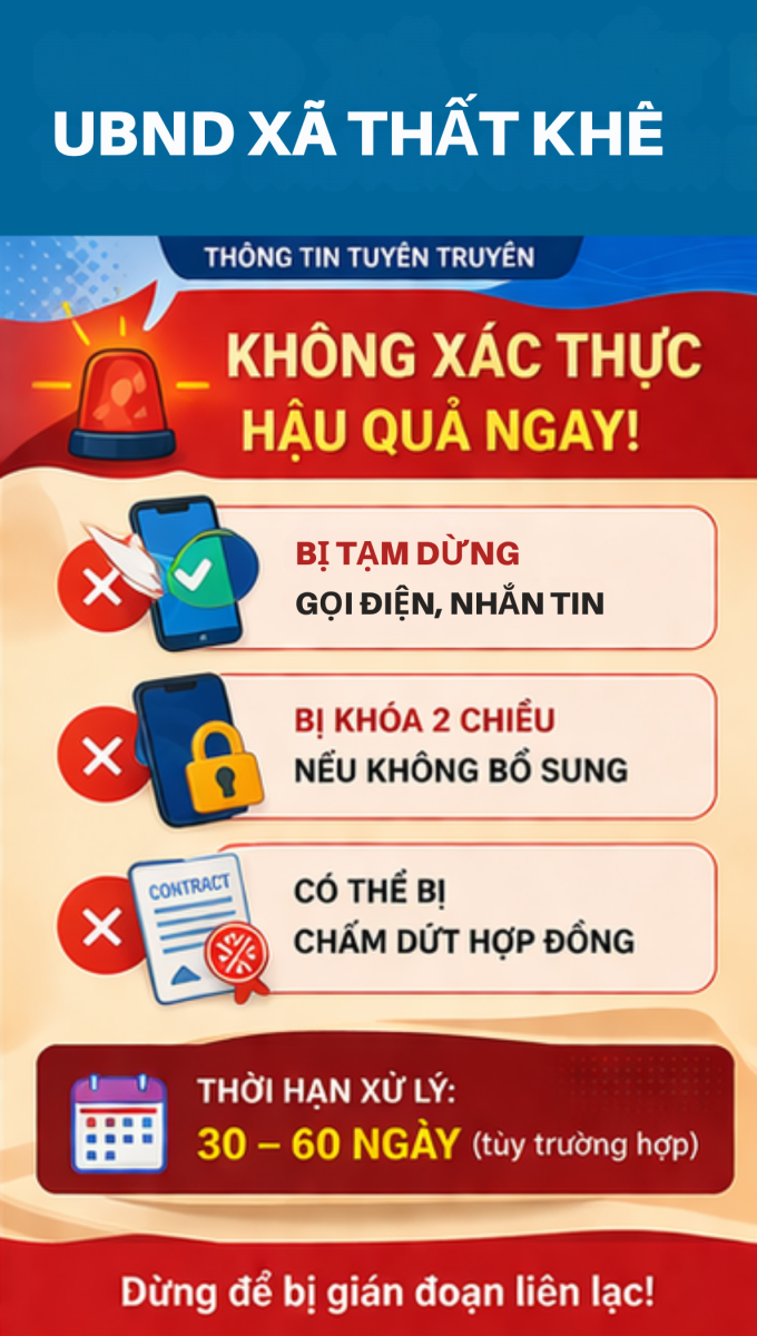 Thứ sáu, 10/04/2026 | 21:29 A- A A+ | Thông tư số 08/2026/TT-BKHCN hướng dẫn việc xác thực thông tin thuê bao di động mặt đất. Thông tư có hiệu lực thi hành từ ngày 15/4/2026, riêng Điều 8 của Thông tư có hiệu lực từ ngày 15/6/2026 Chia sẻ Đọc bài Lưu Tập tin đính kèm Tác giả: Trang Thông tin điện tử xã Thất Khê Nguồn:thatkhe.langson.gov.vn Sao chép liên kết Tin tức liên quan Thông tư số 08/2026/TT-BKHCN hướng dẫn việc xác thực thông tin thuê bao di động mặt đất. Thông tư có hiệu lực thi hành từ ngày 15/4/2026, riêng Điều 8 của Thông tư có hiệu lực từ ngày 15/6/2026 CẢNH BÁO VỀ HÀNH VI THU THẬP TRÁI PHÉP DỮ LIỆU CÁ NHÂN Nghị quyết Về việc công bố danh sách chính thức những người ứng cử đại biểu Hội đồng nhân dân xã Thất Khê khoá II, nhiệm kỳ 2026 - 2031 theo từng đơn vị bầu cử Tặng quà tết cho các đơn vị và các gia đình chính sách Danh sách các đơn vị bầu cử Đại biểu Hội đồng nhân dân xã Thất Khê nhiệm kỳ 2026-2031 Đội quản lý điện lực khu vực Tràng Định – thực hiện TRI ÂN KHÁCH HÀNG NĂM 2025 Bí thư Đảng ủy xã Thất Khê làm việc với Trung tâm Phục vụ hành chính công Thất Khê tổ chức Lễ ra mắt Mô hình “Phụ nữ tự lực” và tập huấn, tuyên truyền nâng cao kiến thức chăm sóc sức khỏe, kỹ năng tự chăm sóc, bình đẳng giới và hòa nhập xã hội cho phụ nữ khuyết tật. Công khai niêm yết cấp Giấy chứng nhận lần đầu