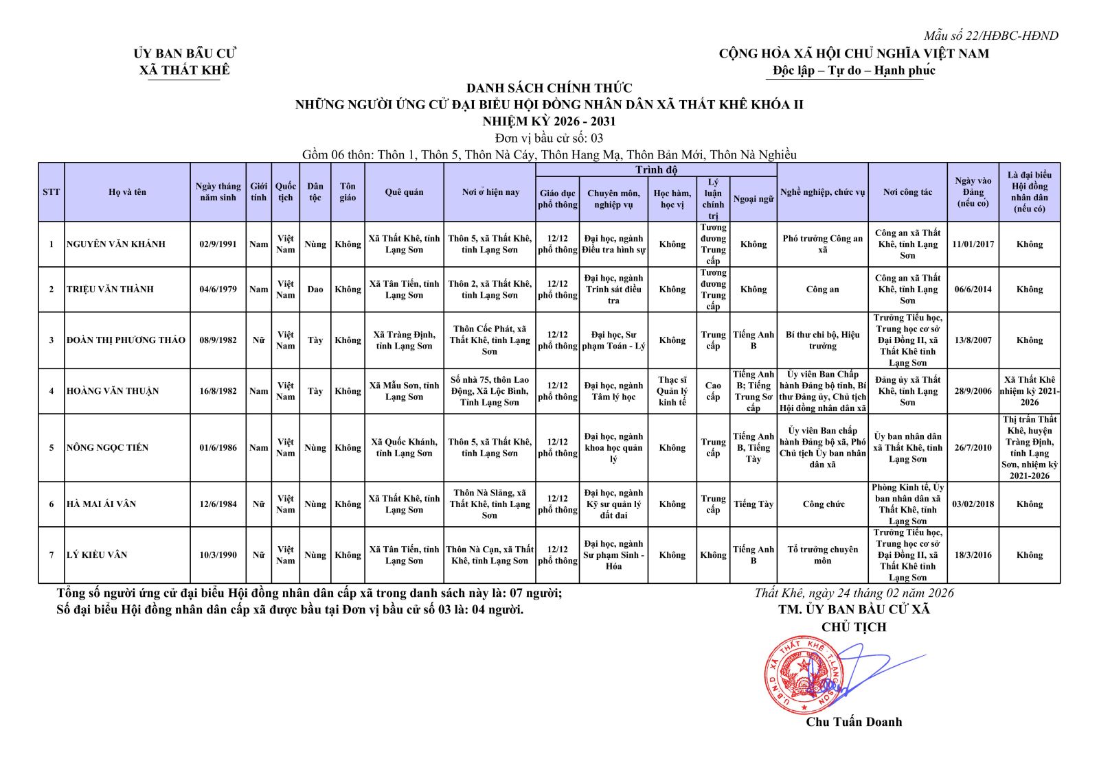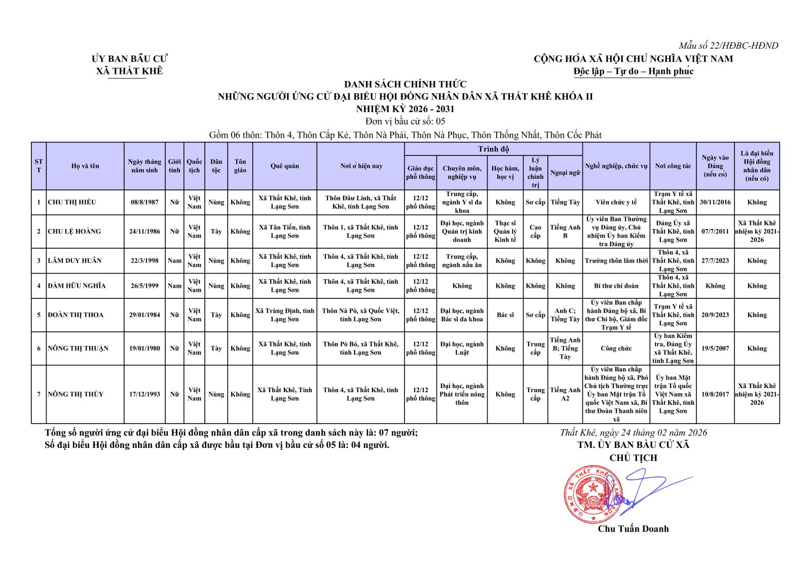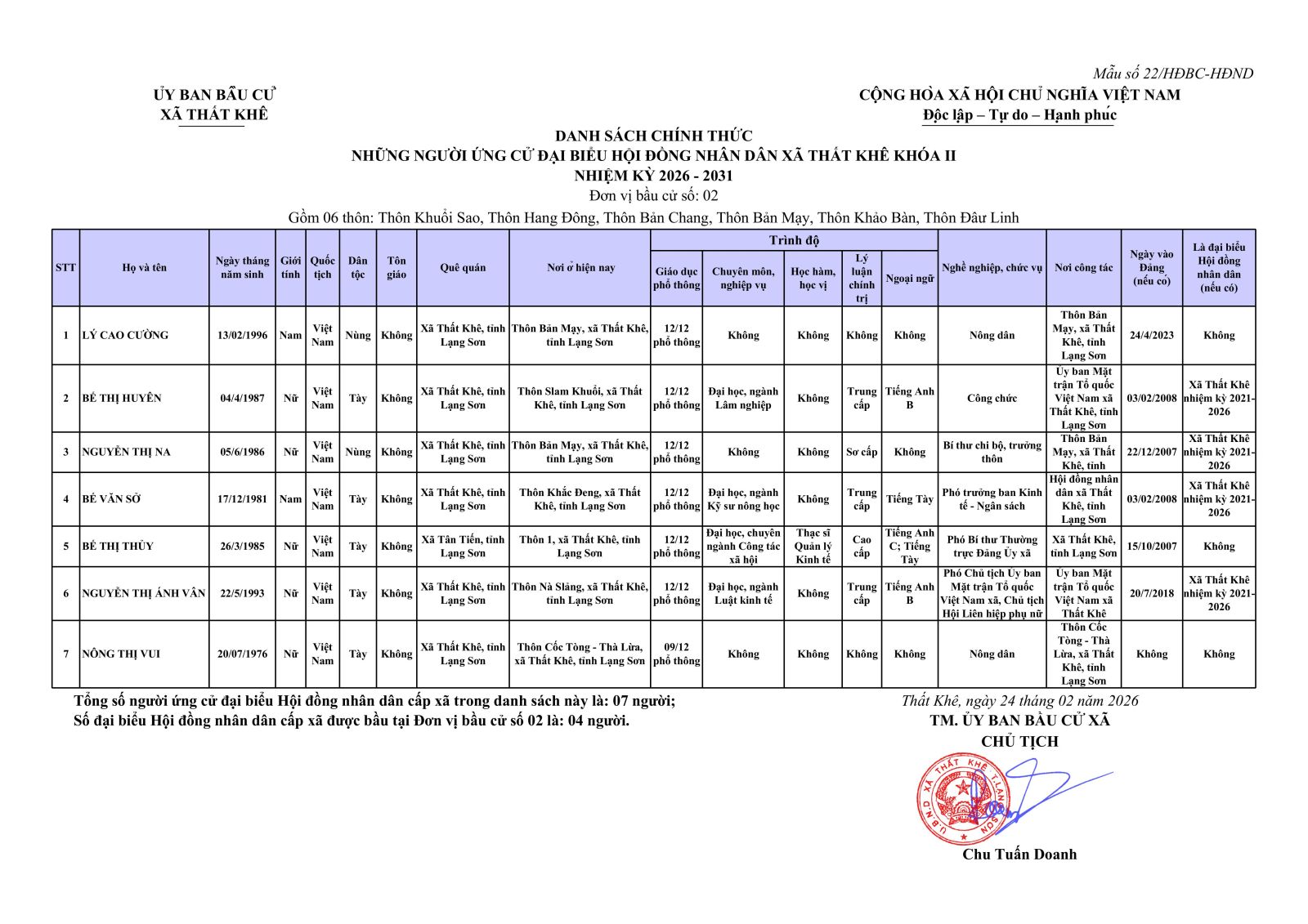 Nghị quyết Về việc công bố danh sách chính thức những người ứng cử đại biểu Hội đồng nhân dân xã Thất Khê khoá II, nhiệm kỳ 2026 - 2031 theo từng đơn vị bầu cử