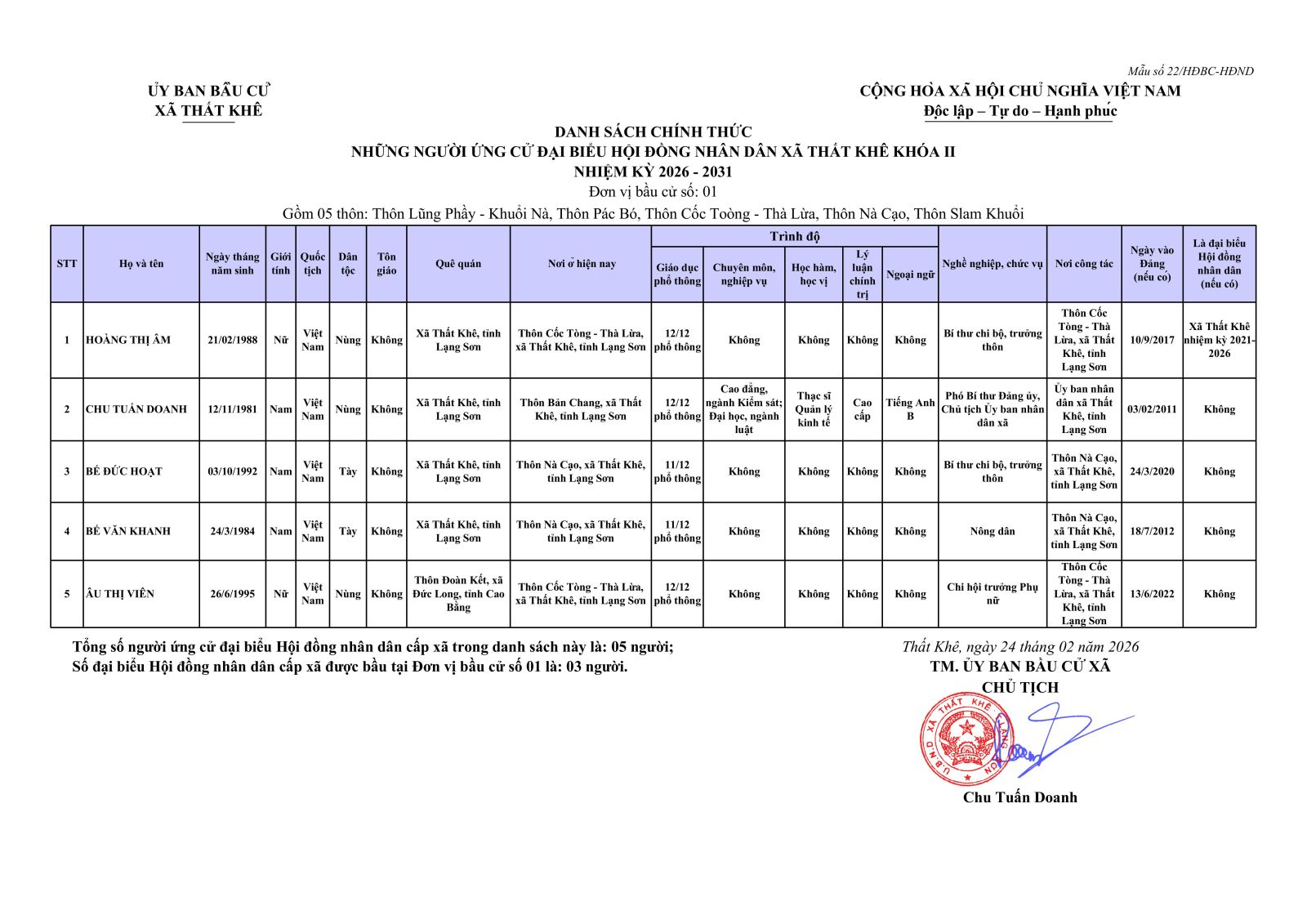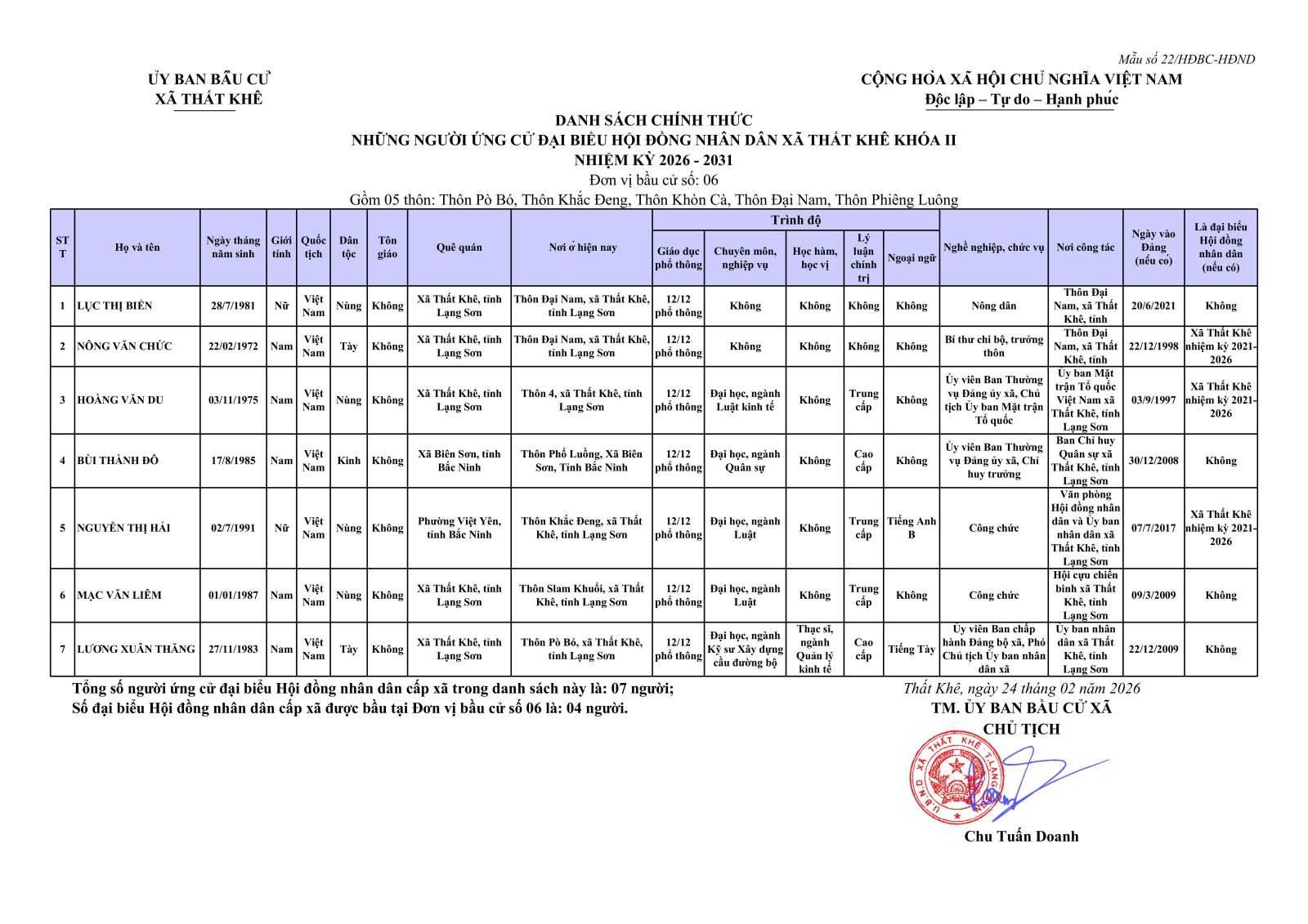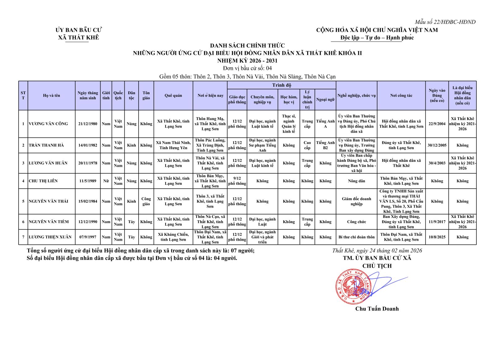 Nghị quyết Về việc công bố danh sách chính thức những người ứng cử đại biểu Hội đồng nhân dân xã Thất Khê khoá II, nhiệm kỳ 2026 - 2031 theo từng đơn vị bầu cử