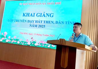 Phát biểu tại buổi lễ, đồng chí Nông Ngọc Tiến nhấn mạnh: hát Then, đàn Tính là di sản quý báu của quê hương, mang trong mình giá trị gắn kết cộng đồng và nuôi dưỡng niềm tự hào dân tộc. Lớp học không chỉ tạo điều kiện để các thế hệ được tiếp cận, tìm hiểu di sản, mà còn góp phần lan tỏa, gìn giữ bản sắc văn hóa ngay tại quê hương. Đồng chí mong các học viên tham gia với tinh thần nhiệt tình, trách nhiệm, nỗ lực học tập và thực hành, để lớp học đạt kết quả tốt đẹp.