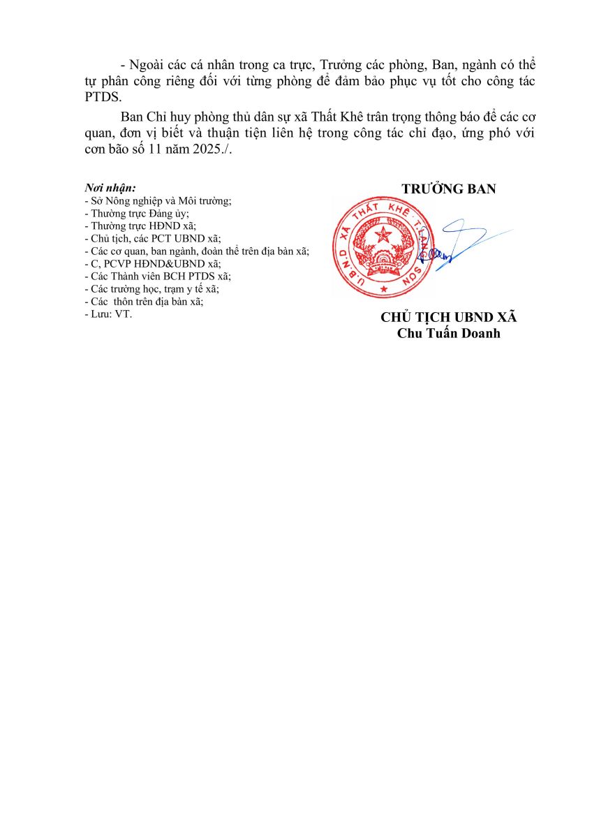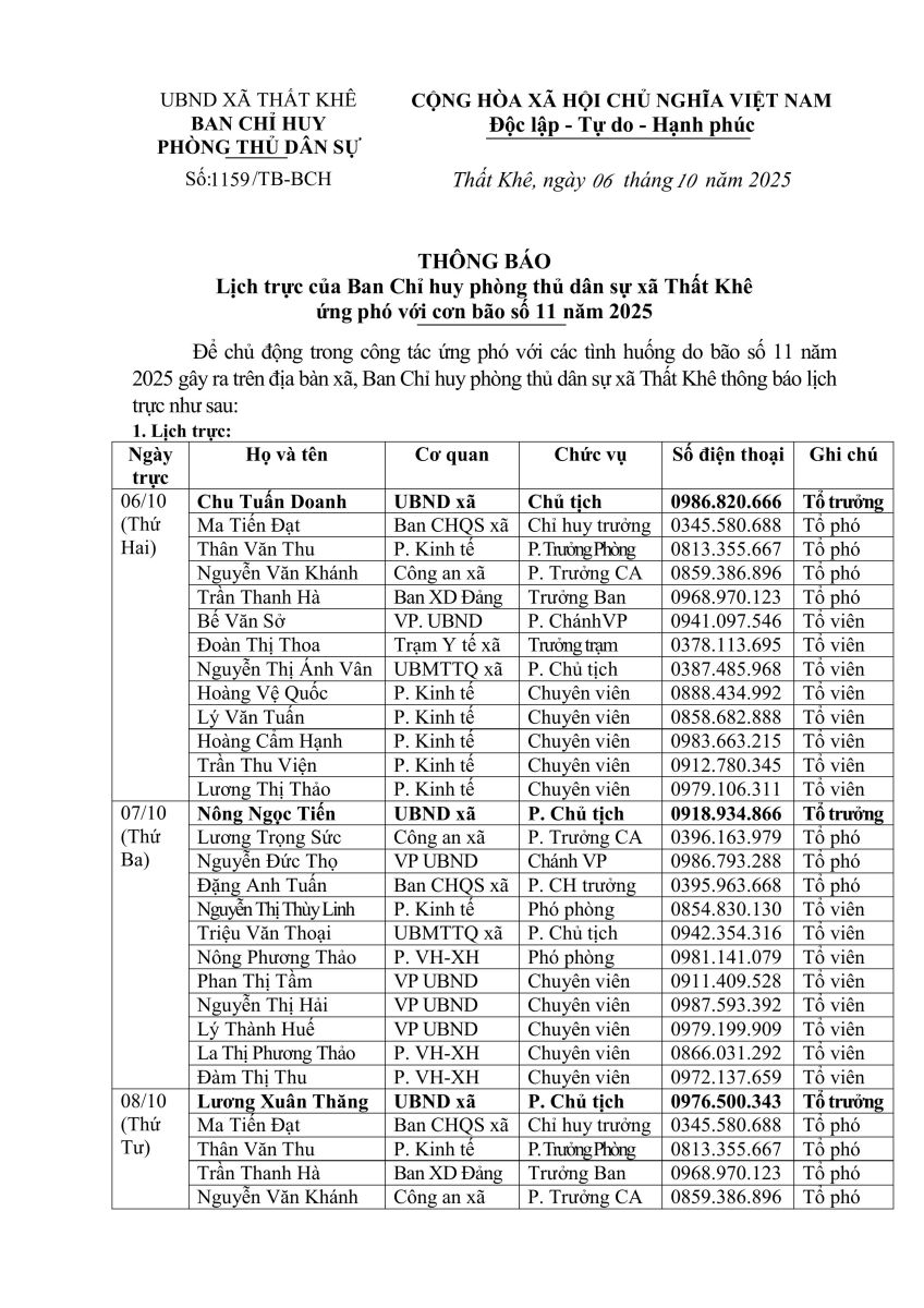 Thứ hai, 06/10/2025 | 15:28 A- A A+ | Lịch trực Chia sẻ Đọc bài Lưu Tác giả: Xã Thất Khê Nguồn:thatkhe.langson.gov.vn Sao chép liên kết Tin tức liên quan Công an xã Thất Khê không quản ngại gian khó, hết mình vì Nhân Dân giữa tâm bão Matmo 🌧️ Thông báo số điện thoại đường dây nóng UBND xã Thất Khê tổ chức tặng quà cho thiếu niên, nhi đồng ở 33 thôn bản, 13 trường học và Mái ấm tình thương Vinh Sơn Lịch trực Thông báo lũ 🌧️🌪️ THÔNG BÁO KHẨN: CHỦ ĐỘNG ỨNG PHÓ VỚI BÃO SỐ 10 UBND xã Thất Khê thông báo ứng phó Bão số 9 (RAGASA) 🎉✨ Lễ Hội Đền Trần Hưng Đạo (Đền Gốc Sung) năm 2025 ✨🎉 Tự hào 75 năm ngày giải phóng Thất Khê (10/10/1950 – 10/10/2025)