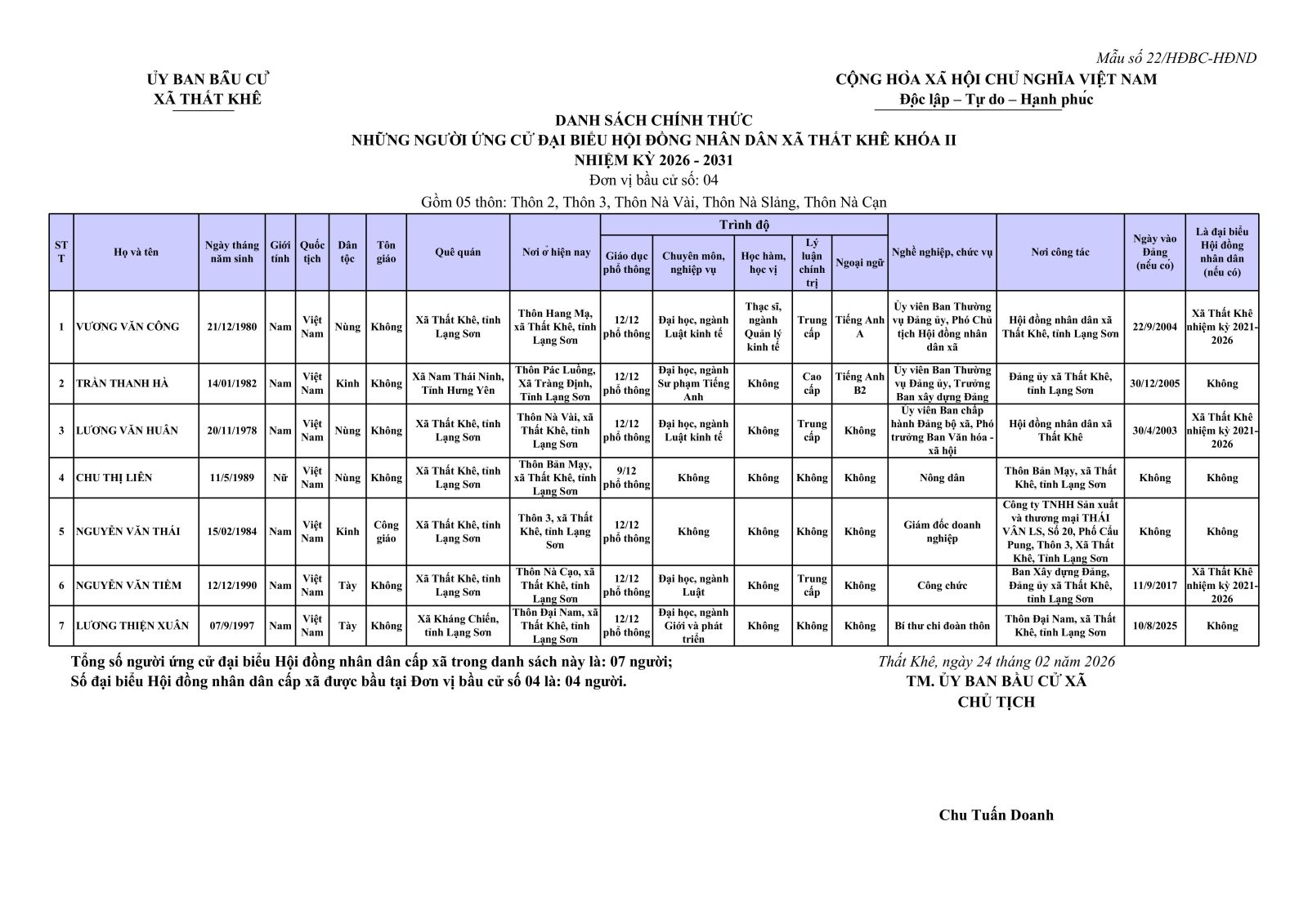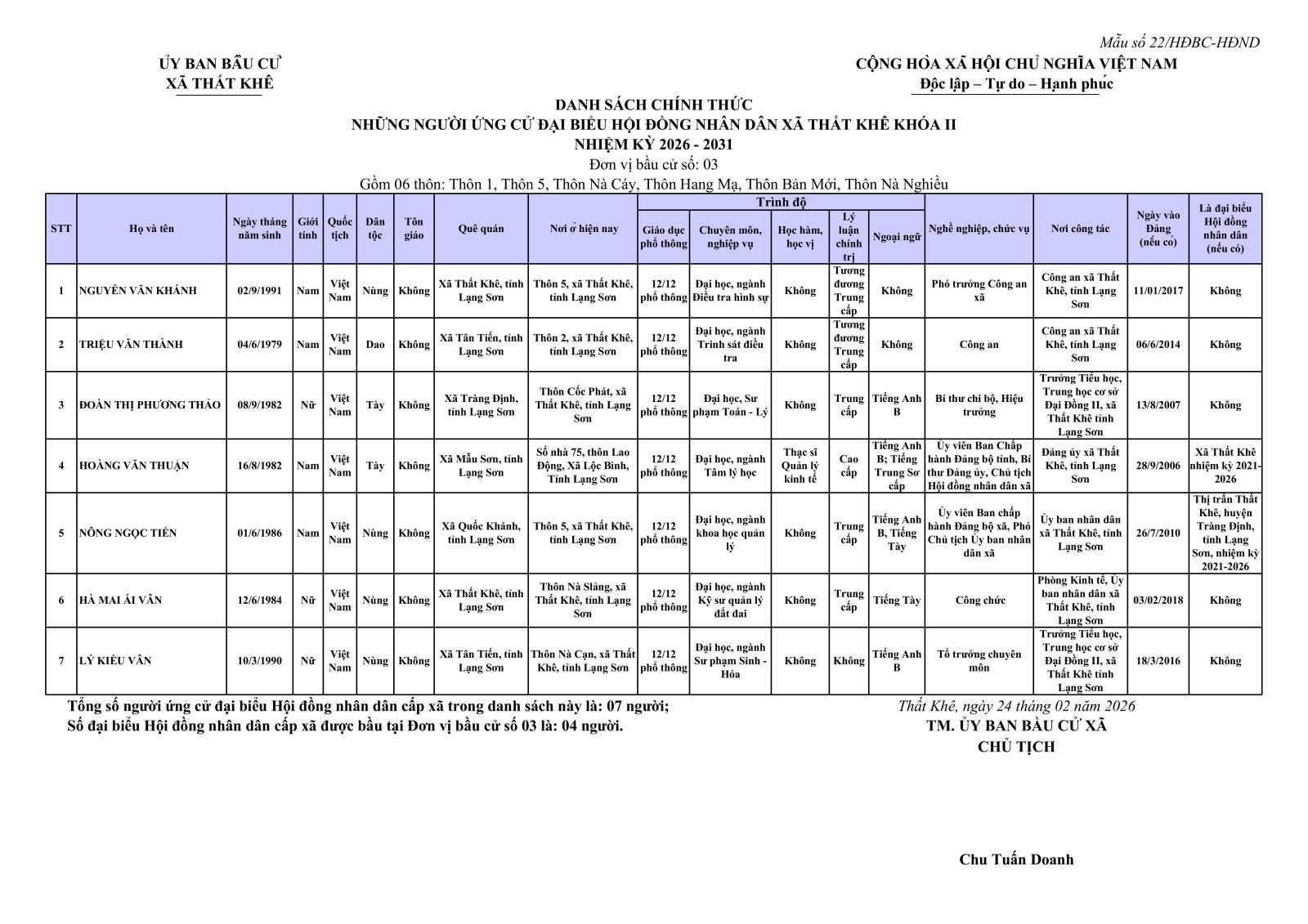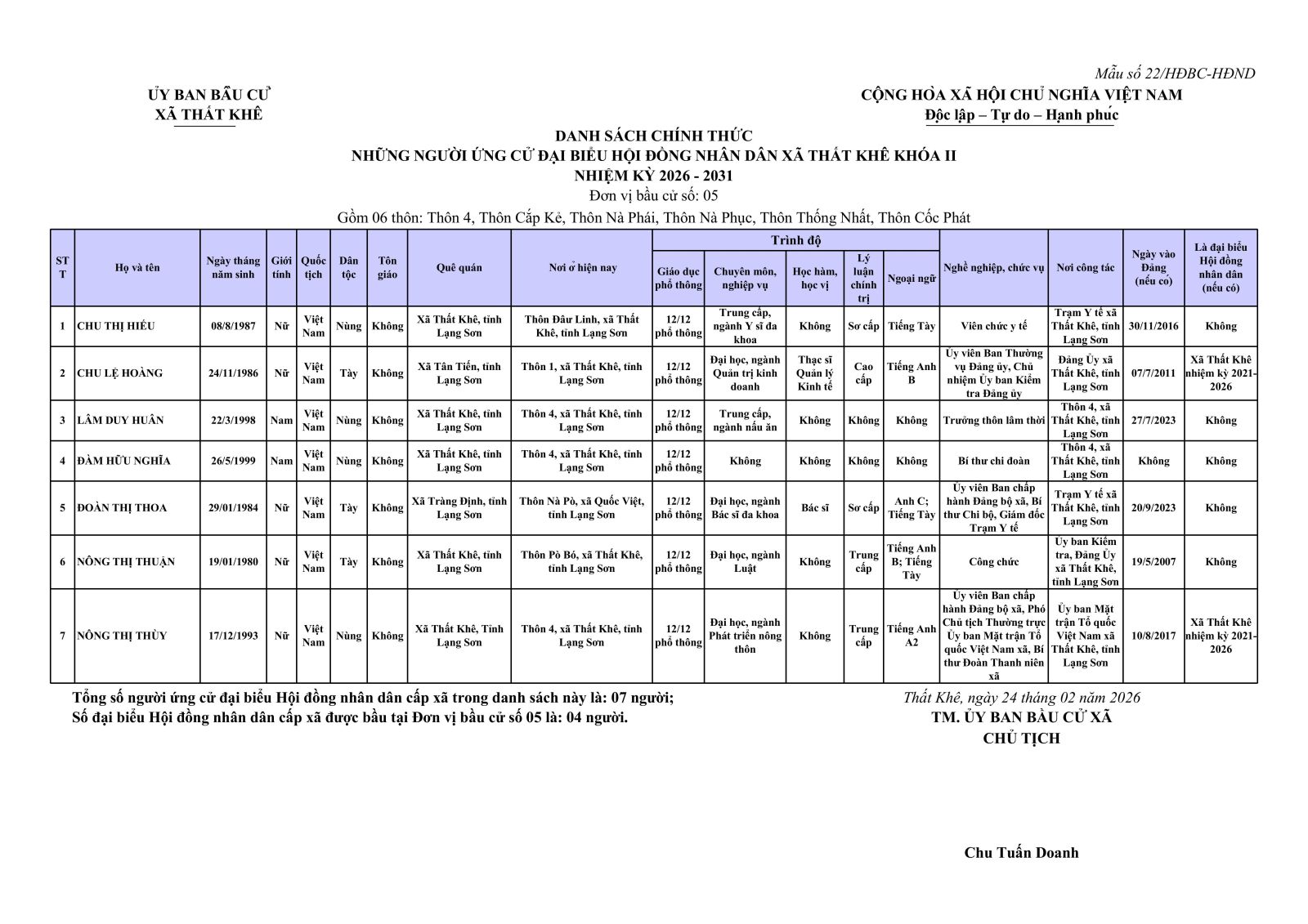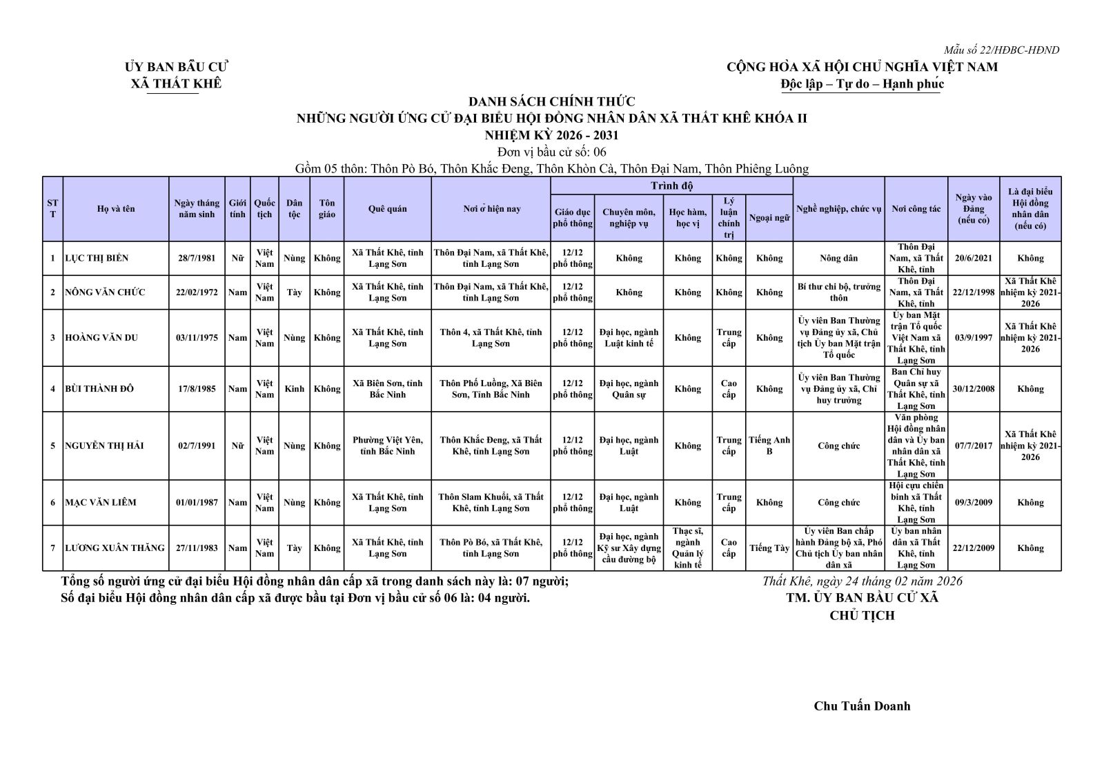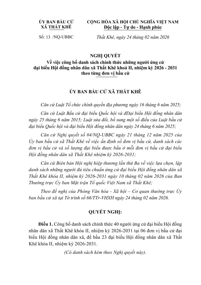 Nghị quyết Về việc công bố danh sách chính thức những người ứng cử đại biểu Hội đồng nhân dân xã Thất Khê khoá II, nhiệm kỳ 2026 - 2031 theo từng đơn vị bầu cử